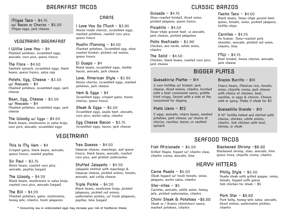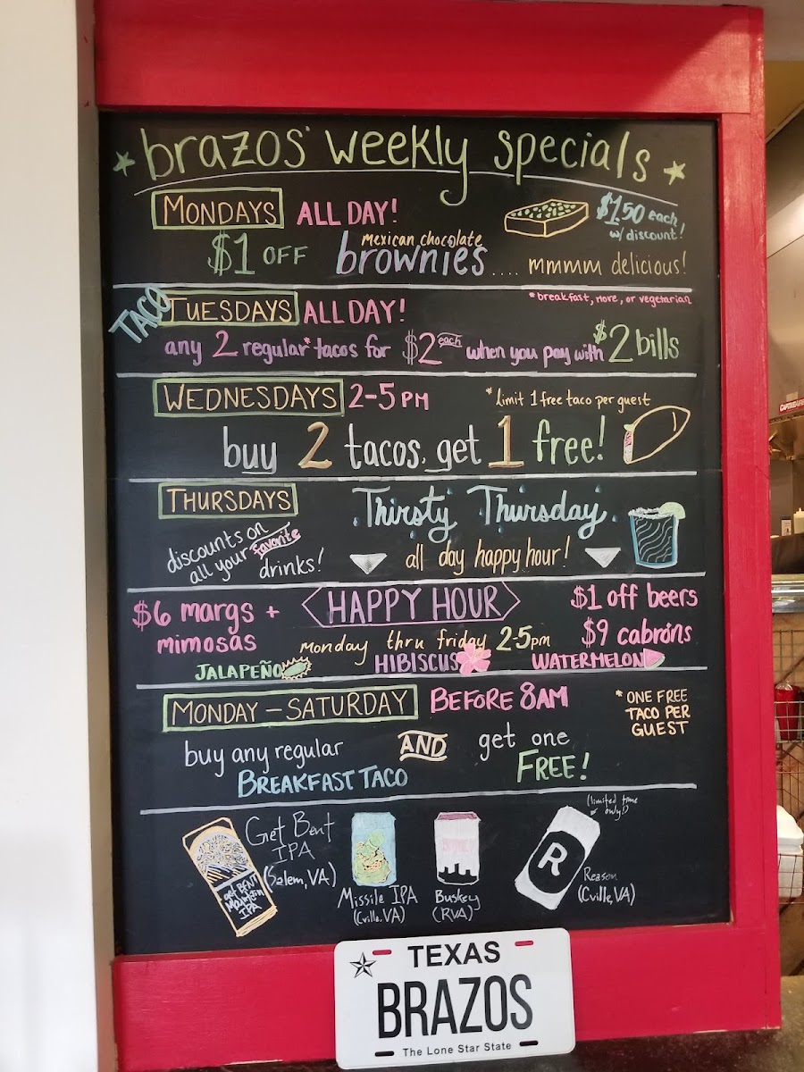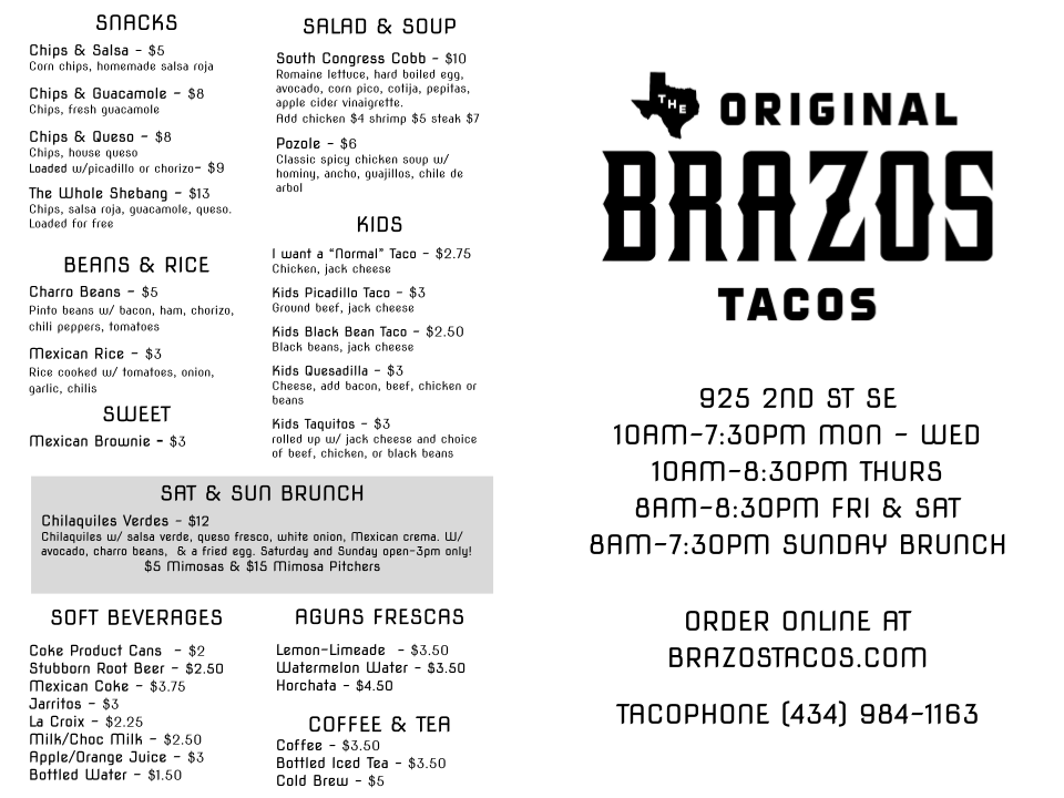 If you're craving delicious, freshly made tacos with a twist, the Brazos Tacos Menu is where you'll want to be. Nestled in the heart of Charlottesville at 925 2nd St SE, this cozy spot is perfect for those who love authentic flavors with a side of creativity. Whether you’re in the mood for something classic like carne asada or want to try something new, like their zesty shrimp tacos, there's a choice for every taste.